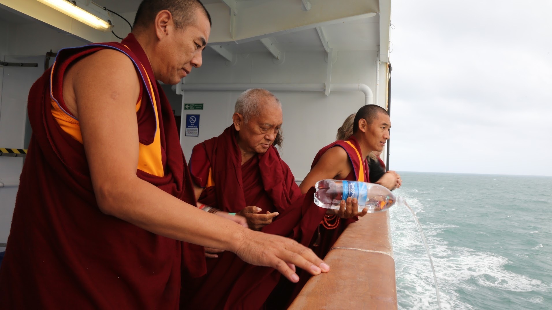 - 圖3:攝於紐西蘭(Newziland),我(右一)陪仁波切(中間)佈施加持水,加持海中一切有情。