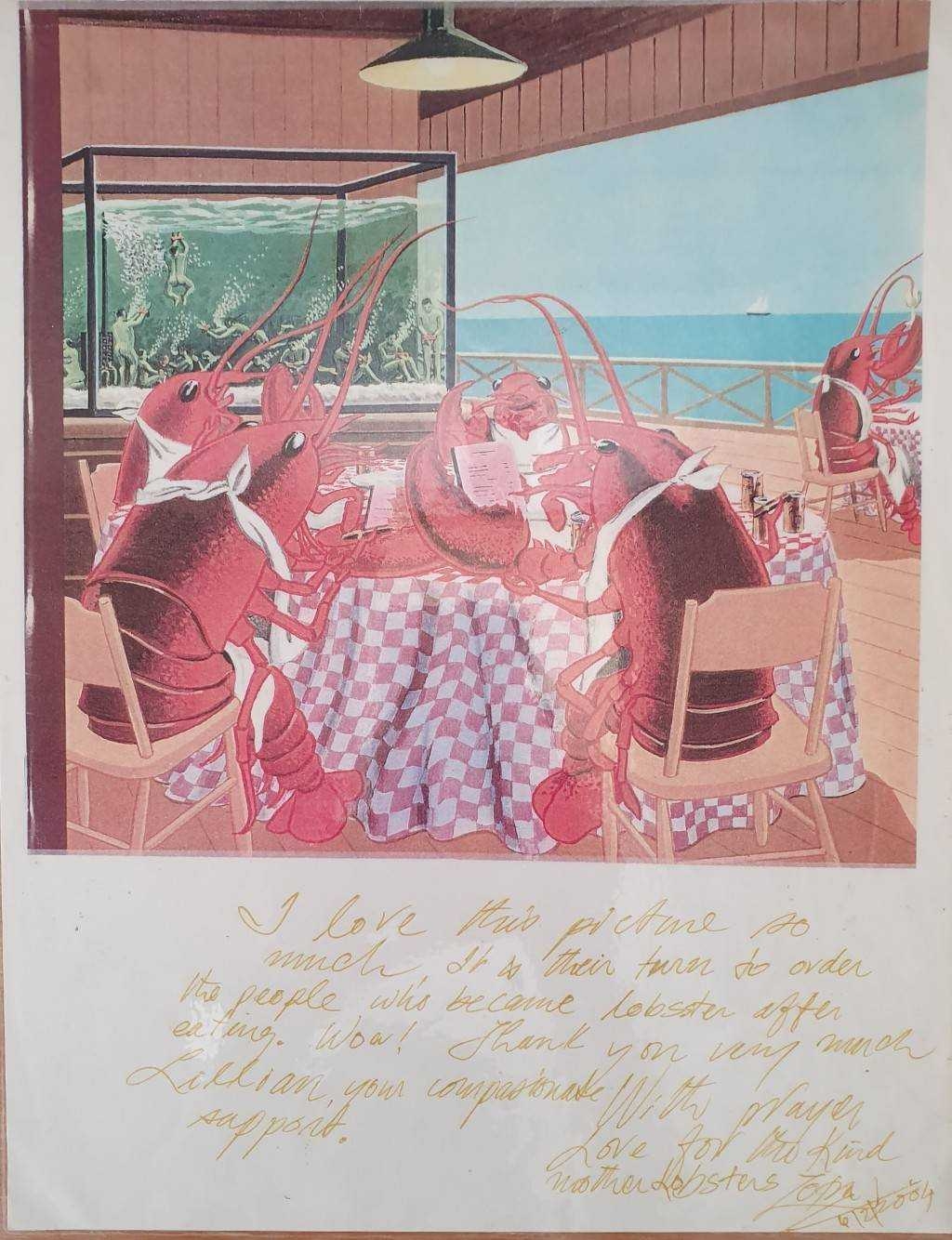 仁波切弘法結束離開後,從國外寄來一張卡片,卡片上一群蝦子圍坐在桌旁,看著水族箱,期待的拿著刀叉等食物上桌,而水族箱裡,養著一個一個小小的人,趴在玻璃上,求救似的想離開。