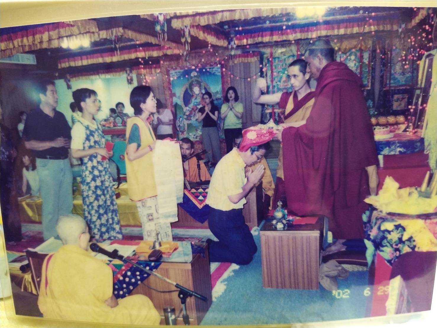 - 圖2:民國91年6月29日,桃園馬頭明王中心,袞卻格西舍利展,我(左一黑色上衣者)正排隊準備接受聖物加持。(右一)持聖物加持的僧衆為舉昧格西。(右二)解說者,為袞卻格西侍者 – 天津梭巴格西。(右三)跪著接受加持的,是我從初中就認識的好友Michael 任。