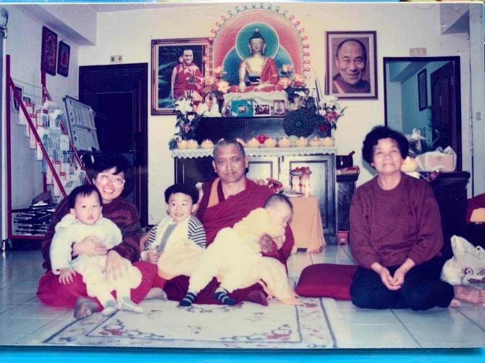 - 左圖:攝於民國82年底左右,羅斯福路經續佛法中心。我抱著次子(左1),仁波切抱著我三歲多的長子及只有幾個月大的三子。