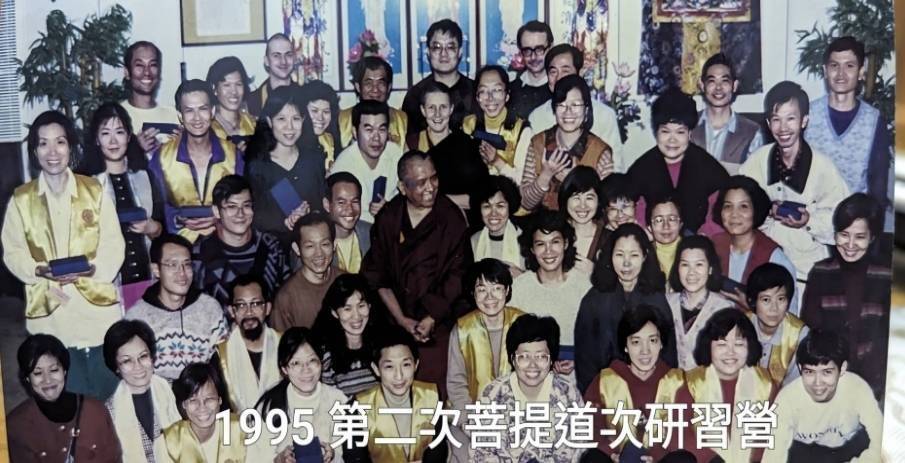 - 圖2:1995年2月,第二次菩提道次第研習營,我坐在梭巴仁波切左手臂前方(短髮,穿著金色志工背心)。