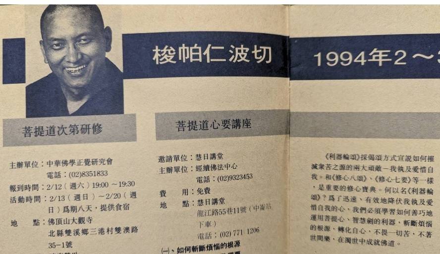 - 圖1:1994年2月,仁波切在台灣第一次菩提道次第研習營的介紹文宣。