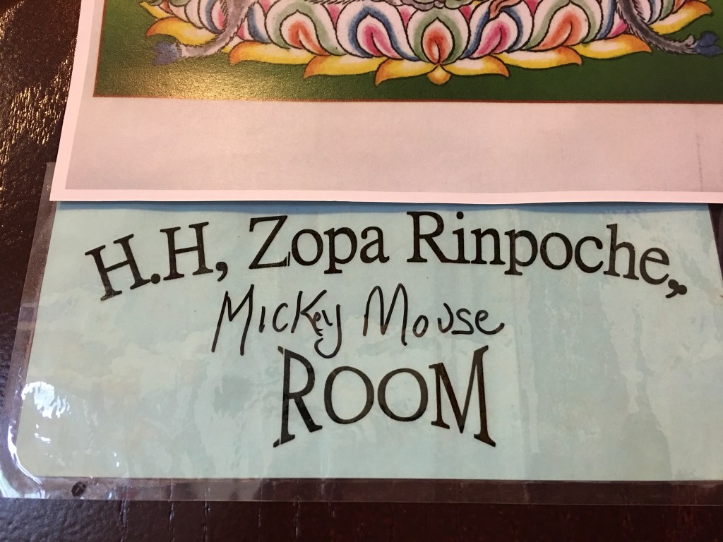 - 圖10:2016年,也是仁波切最後來台灣的時間,仁波切在標示他房間的貼紙上,親自簽下(Mickey Mouse)。