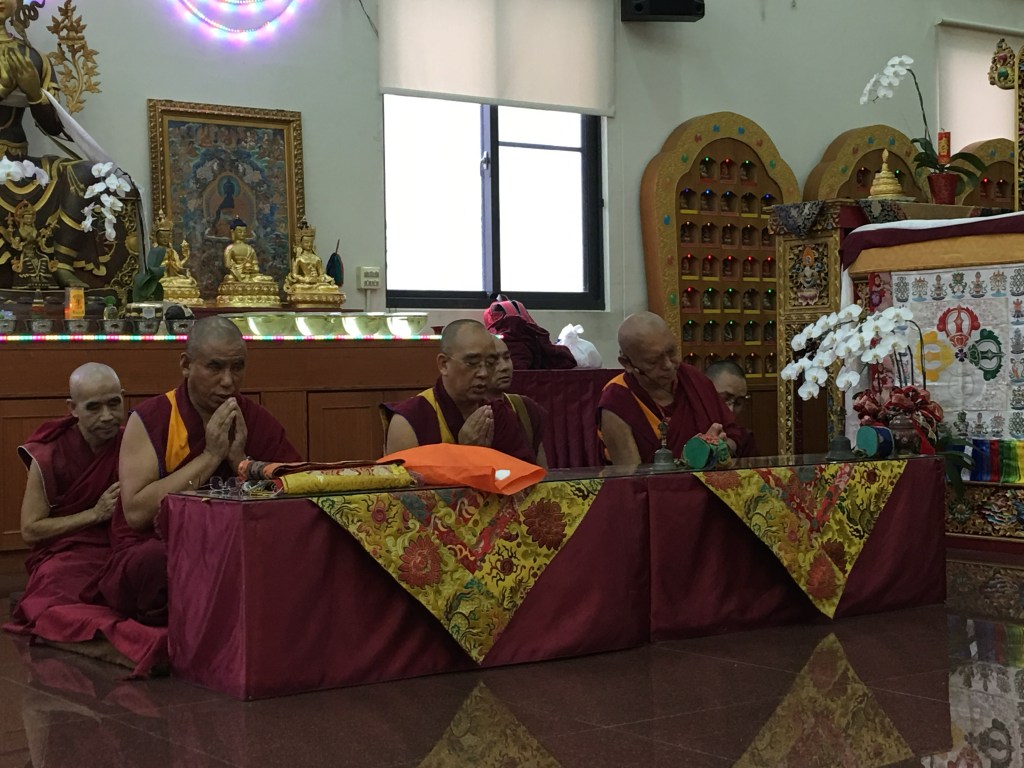 - 圖4:2016年喇嘛梭巴仁波切來台中釋迦牟尼佛中心閉關時,與格西們及僧眾們在大殿修法。