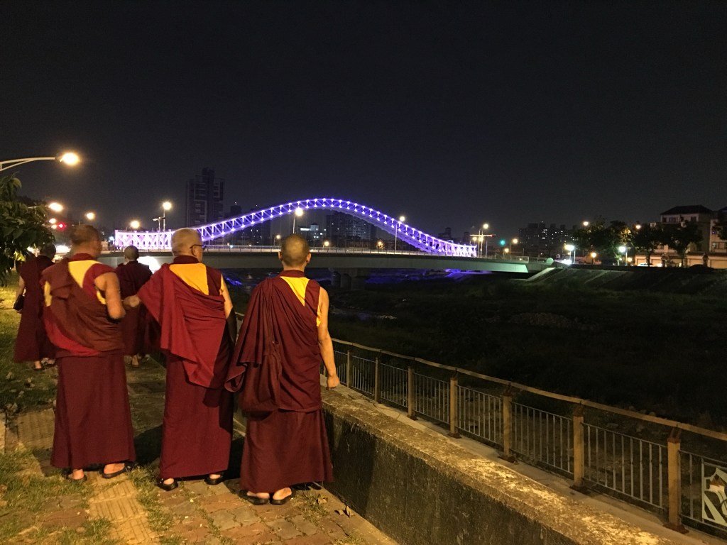 - 圖7:梭巴仁波切與侍者們及中心的執事尼僧晚上在旱溪的中心附近散步。