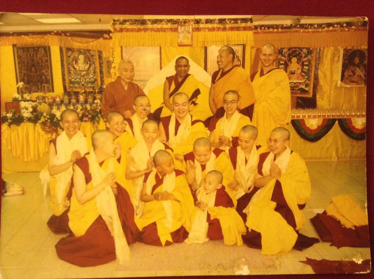 民國84年三月,剛買下的八德路道場舉行剃度典禮,這是梭巴仁波切首次在台灣剃度弟子,設立僧團,當時道場向銀行貸款,一個月利息支出就要二十萬 ,在二十多年前,這是一筆龐大的金額,因爲自己有中華花藝教授執照,就在道場開辦插花班,幫助道場開銷。
